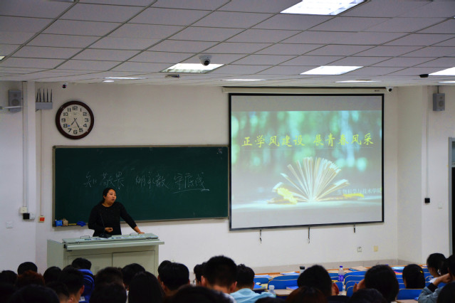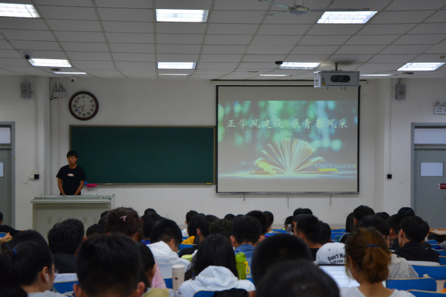 班会上,辅导员首先简要指出并分析了目前学院学风建设方面存在的不足和问题,并表明下一步将加大督查力度,督促学生养成良好的学习习惯,提出了“树立正确治学目标、发扬勤奋的治学精神、培养严谨求实的治学态度及开拓创新的治学作风”的要求。随后,各班班长针对各自班级的学风建设情况做了介绍,并纷纷表示会做好上传下达,沟通协调好班级队伍建设以及班级文化建设,促进班级的发展。于文静阐明了“知敬畏,明礼教,守底线”的理念,希望同学们常怀敬畏之心,知书明理,坚守做人做事的原则,不断的提升自我。最后。李向辉从“角色定位、思想认识”“学业互勉、示范带动”“自我管理、诚实守信”和“遵规守纪、学业预警”四个方面进行了强调,要求学生必须守好学习主业本分,严格自我管理,发挥好学生会和班委的作用,强化团队协作,共同加强改进学院学风建设。