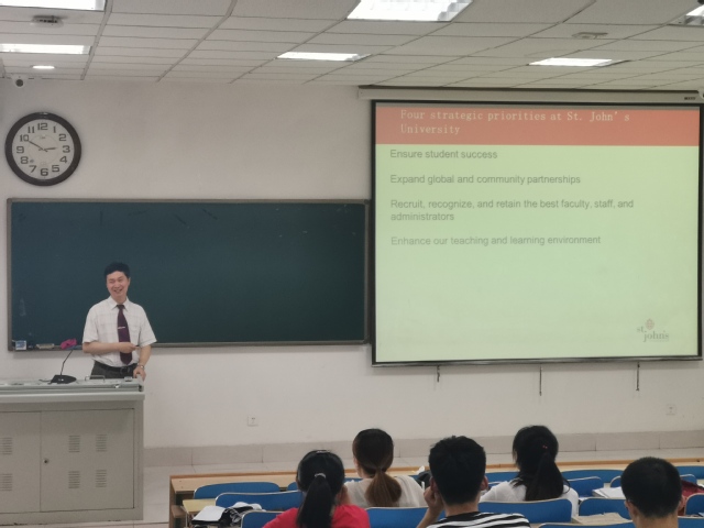 在轻松自然的交流氛围中,陈教授以幽默风趣的语言,侃侃而谈,首先介绍了美国圣约翰大学的校园文化、专业设置以及为杏吧原创 本科生申请留学深造提供的四种可行方案,着重讲解了申请攻读圣约翰大学研究生所需要的基本条件和申请流程,并耐心回答了学生们的提问。