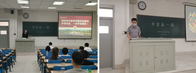 课上,李向辉以“疫情防控与中华民族精神”为主题,通过抗疫相关的事例和数据,从伟大民族精神是我们奋勇前行的不竭动力、伟大民族精神凝聚抗疫强大力量及疫情防控与中华民族精神的升华三个方面,为同学们讲解了疫情防控中中华民族精神的伟大力量和新的时代内涵。高志芹就春季学期线下线上教学安排、线下上课防护措施、考试安排和毕业生答辩、就业以及个人日常防护等问题进行了要求和强调。于文静和孙同毅分别就在校学生安全、常态化防控及日常教学等具体问题作了说明。