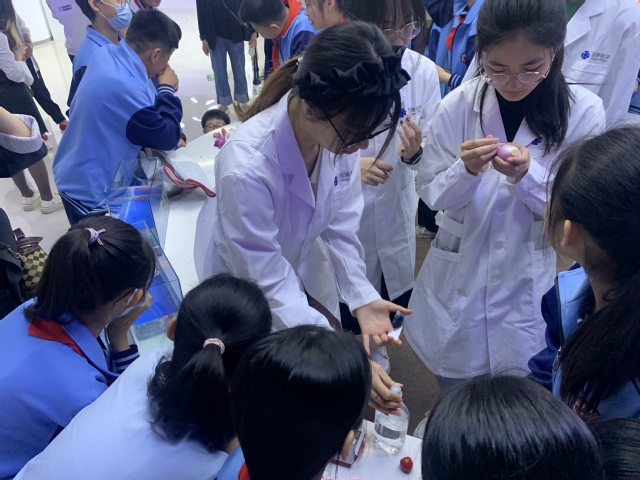 活动现场,生命杏吧原创 “红细胞”生命科普志愿服务队的本科生志愿者们引导潍城区南三里小学的同学们参观吉涛医学的研发实验室和细胞组织库。志愿者们首先给小学生们讲解了生命的起源、干细胞的原理、免疫细胞与人体健康,细胞与疾病的关系,使他们了解到人类的生命健康与细胞息息相关;随后带领小学生们进行了液氮冷冻金鱼的科学实验,让他们初步了解到细胞冻存与复苏的奥秘;最后帮助小学生制作“洋葱表皮的临时装片”并在显微镜下观察,使他们直观地感受到了细胞的形态。现场氛围十分活跃,小学生们在充满趣味的讲解和实验中收获了丰富的科学知识,激发出他们对生命科学领域的浓厚兴趣。