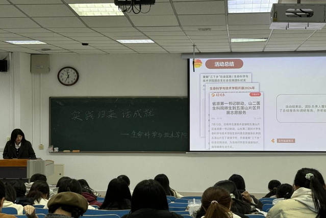 交流会上,各志愿服务队以及志愿者们纷纷讲述了在暑期时积极参与的丰富多彩、的社会实践项目。“助农在行动,生科促发展”志愿服务队的成员们赴日照市五莲县丁家楼子村开展志愿服务,助力乡村振兴,切实看到了乡村在新时代背景下日新月异的变化;“生命脉络”先锋志愿服务队赴白浪河开展环保宣传、环境清洁、沿路清洁等社会实践活动,提高公众的环保意识,倡导绿色生活方式;志愿者们积极报名参与青鸟计划,前往安仁镇王子付村等地为200多名少年儿童提供作业辅导、兴趣培养等公益项目,让农村留守儿童收获成长。知之愈明,则行之愈笃;行之愈笃,则知之益明。同学们走上讲台分享他们在实践中的所见所闻、所感所获,展示着青春在社会实践中绽放出的璀璨成就。