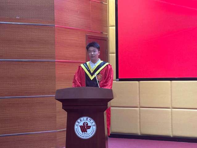 学院青年博士欧阳旭东作为教师代表发言,他深情回忆和赞扬了同学们在课堂上、实验室里和社会实践中的种种表现和收获,并寄语毕业生不忘初心,秉持终身学习的理念,立大志成大才,矢志创新,勇于担当,努力创造美好未来。