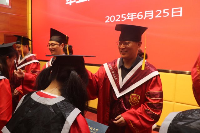 学院学位评定委员会委员为毕业生逐一拨穗正冠、颁授学位证书。同学们手捧证书,内心充满喜悦和激动。