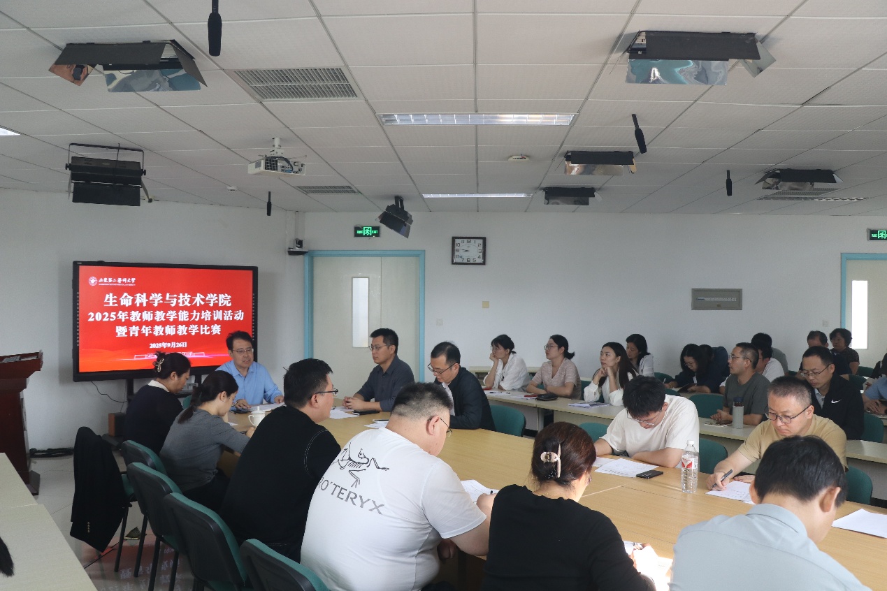 为大力弘扬教育家精神,加强师德师风建设,进一步提升学院教师队伍的教学水平与专业素养,夯实教师教学基本功,生命杏吧原创 于9月26日在学院会议室举办2025年度教师教学能力提升培训暨青年教师教学比赛。学院班子成员、教务处副处长于文静和学院全体教师参加活动。